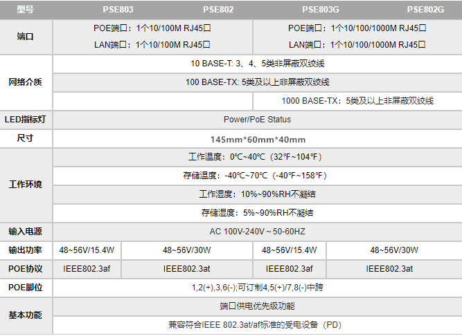 PSE802G单口千兆2.5G以太网供电设备,该供电器适应于室内使用(室外请放入防水箱,在100VAC~240VAC输入电压都能正常工作,该供电电源与网络终端设备之间通过超5类线缆连接,具有一个以太网数据端口,一个数据和电源合成后的输出埠。该设备可以为一路以太网设备,如路由器、交换机、无线AP、网络电话机、工业网络终端、网络摄像机等提供符合IEEE802.3af/at国际标准的POE供电应用,满足无法在远程提供电源的地方或者采用以太网网线供电方式提高系统可靠性、简化设备安装的地方提供高效的工程。同时也可以搭配PoE分离器用(如PS5712,POE5912等)为非PoE设备提供稳定的电源和数据传输。